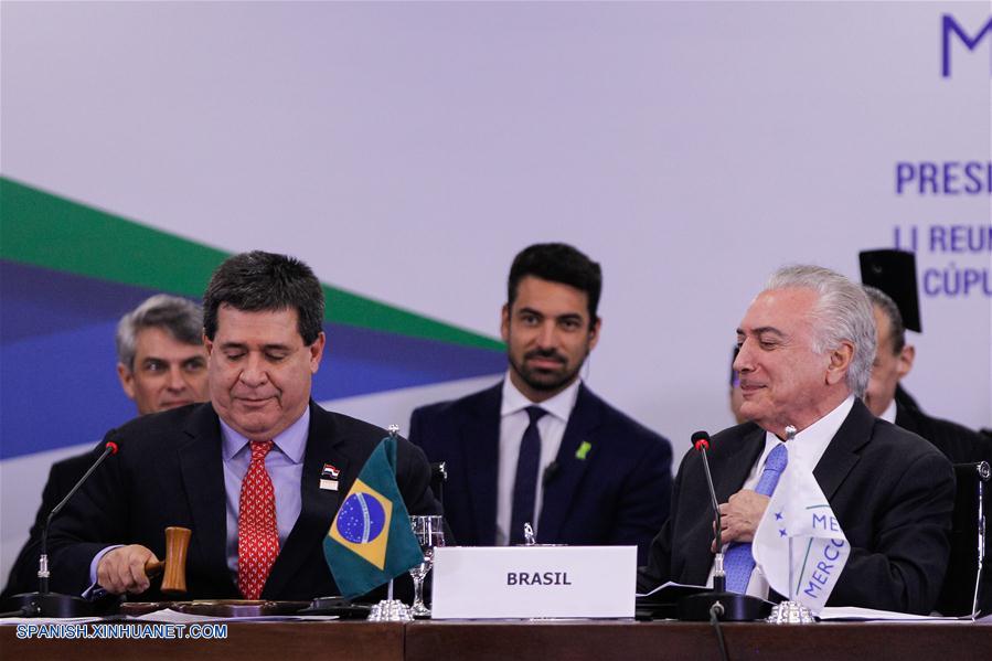 Imagen cedida por la Presidencia de Brasil, de los presidentes de Brasil Michel Temer (d-frente), y de Paraguay Horacio Cartes (i-frente), participando durante la 51 Cumbre del Mercado Común del Sur (Mercosur) y Estados Asociados, en Brasilia, Brasil, el 21 de diciembre de 2017. El presidente de Brasil, Michel Temer, realizó el jueves un balance positivo de la 51 Cumbre del Mercado Común del Sur (Mercosur) y Estados Asociados, y destacó la vocación común de los países fundadores de alcanzar nuevos acuerdos con otros bloques y naciones. (Xinhua/Marcos Correa/Presidencia de Brasil)