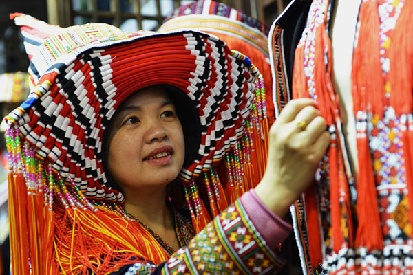 Sufang Li, heredera de las técnicas del vestuario Yao, revisa un modelo en Hezhou, región autónoma de Guangxi Zhuang, 5 de diciembre del 2017. [Foto: VCG]