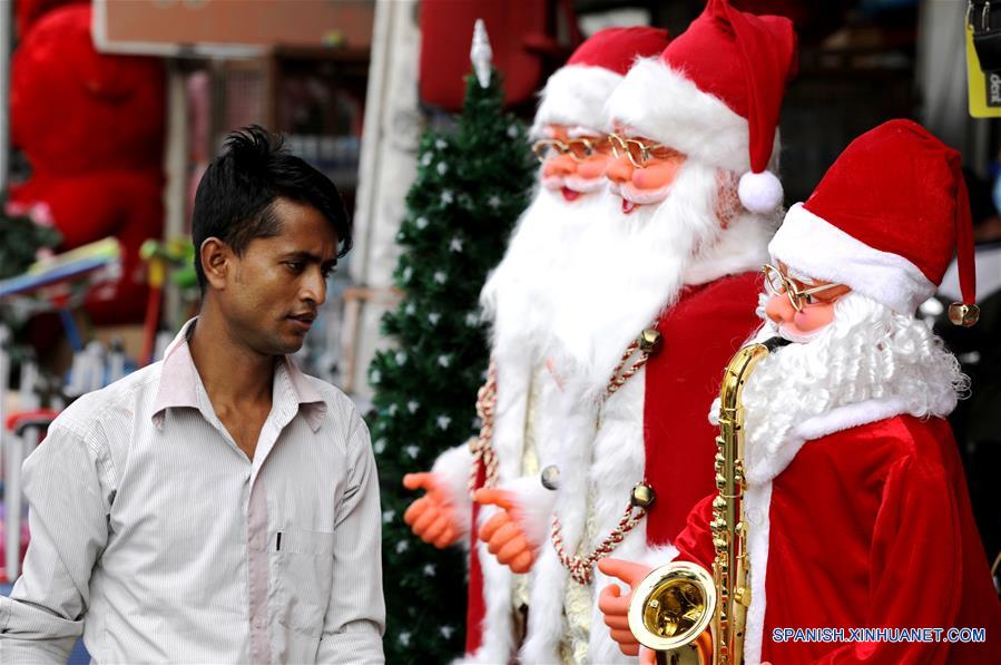 Un hombre camina frente a una tienda que vende productos de Navidad, en Bagdad, Irak, el 23 de diciembre de 2017. Los hombres de negocios iraquíes están decorando sus tiendas con Santa Claus inflables y árboles de Navidad de plástico previo a la Navidad. (Xinhua/Khalil Dawood)