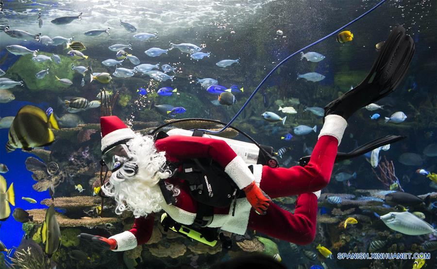 Un buzo vestido como Santa Claus nada en un tanque de peces durante un espectáculo festivo en el Acuario Ripley's de Canadá, en Toronto, Canadá, el 23 de diciembre de 2017. (Xinhua/Zou Zheng)