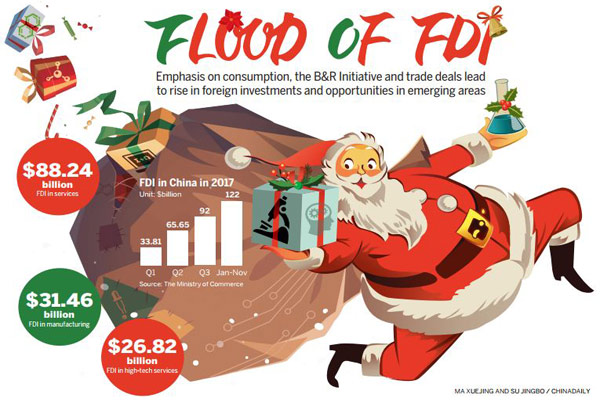 Beijing,25/12/2017(El Pueblo en Línea)-El énfasis en el consumo, la iniciativa “Cinturón y Ruta” y múltiples acuerdos comerciales conducen al alza en las inversiones extranjeras y oportunidades en áreas emergentes durante esta Navidad. Pareciera como si Santa Claus ha desplegado una gran baúl de inversión extranjera directa en China (IED).