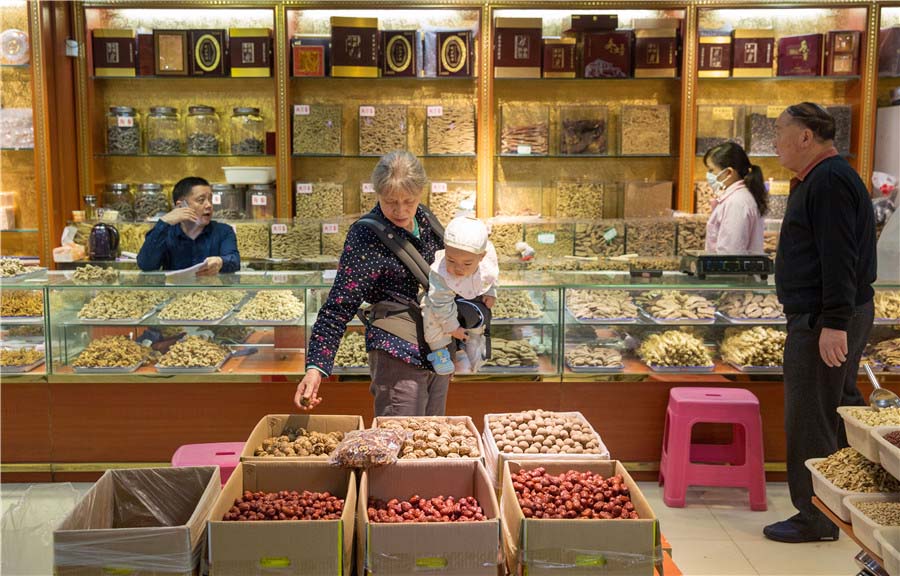 Lugare?os comprar alimentos saludables en un mercado de medicina tradicional china en Chongqing. [Foto: Liu Song]