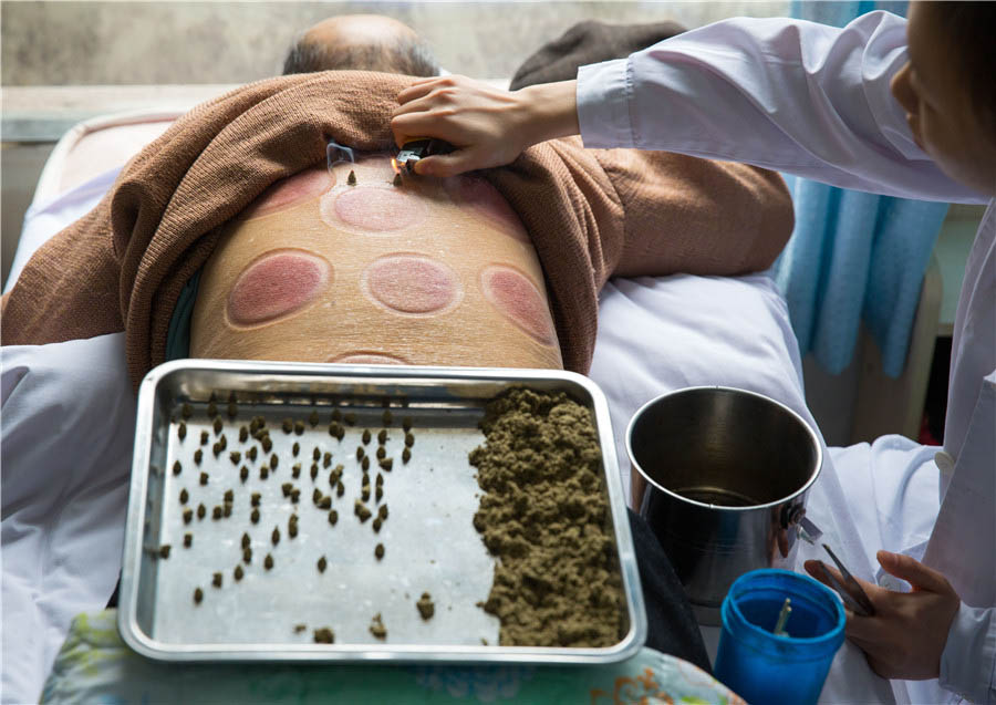 Un paciente recibe moxibustión en un hospital de medicina tradicional china de Chongqing. [Foto: Liu Song]
