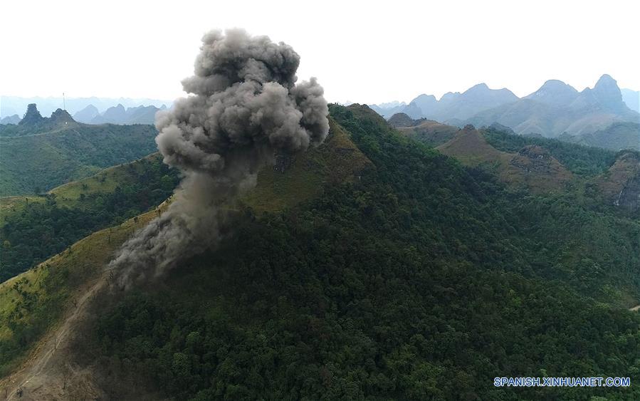 Imagen del 22 de diciembre de 2017, de soldados chinos realizando operaciones con explosivos para retirar las plantas previo a los esfuerzos de remoción de minas en la sección de Guangxi a lo largo de la frontera entre China y Vietnam, en la Región Autónoma Zhuang de Guangxi, en el sur de China. Soldados chinos comenzaron su nueva misión de retiro de minas terrestres a lo largo de la frontera entre China y Vietnam el 27 de noviembre de 2017, cubriendo 2.05 millones de metros cuadrados en 53 sitios cercanos a la frontera de Guangxi. (Xinhua/Zhou Hua)