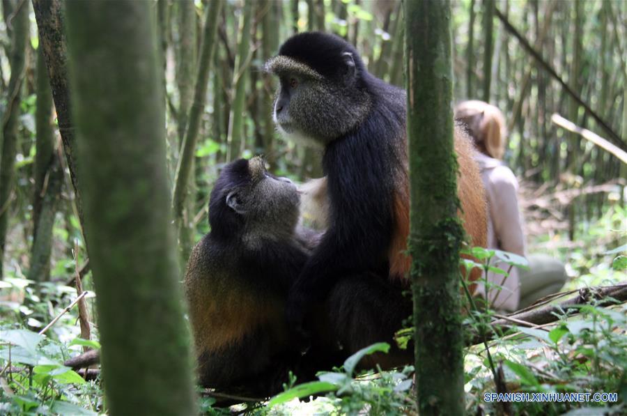 Un mono dorado hembra alimenta a su bebé en el Parque Nacional de los Volcanes, en el occidente de Ruanda, el 25 de diciembre de 2017. De acuerdo con información de la prensa local, el mono dorado está catalogado como una especie en peligro de extinción por la Unión Internacional para la Conservación de la Naturaleza (UICN). Según la UICN, el mono dorado tiene un rango de distribución muy peque?o y se encuentra sólo en los volcanes de Virunga, compartidos por Ruanda, Uganda, y la República Democrática del Congo. (Xinhua/Lyu Tianran)