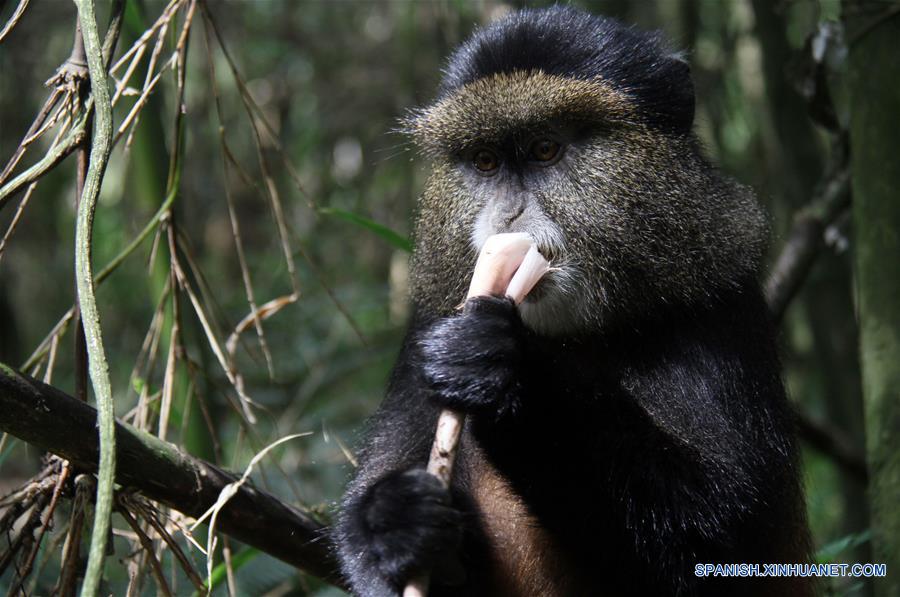Un mono dorado come plantas en el Parque Nacional de los Volcanes, en el occidente de Ruanda, el 25 de diciembre de 2017. De acuerdo con información de la prensa local, el mono dorado está catalogado como una especie en peligro de extinción por la Unión Internacional para la Conservación de la Naturaleza (UICN). Según la UICN, el mono dorado tiene un rango de distribución muy peque?o y se encuentra sólo en los volcanes de Virunga, compartidos por Ruanda, Uganda, y la República Democrática del Congo. (Xinhua/Lyu Tianran)