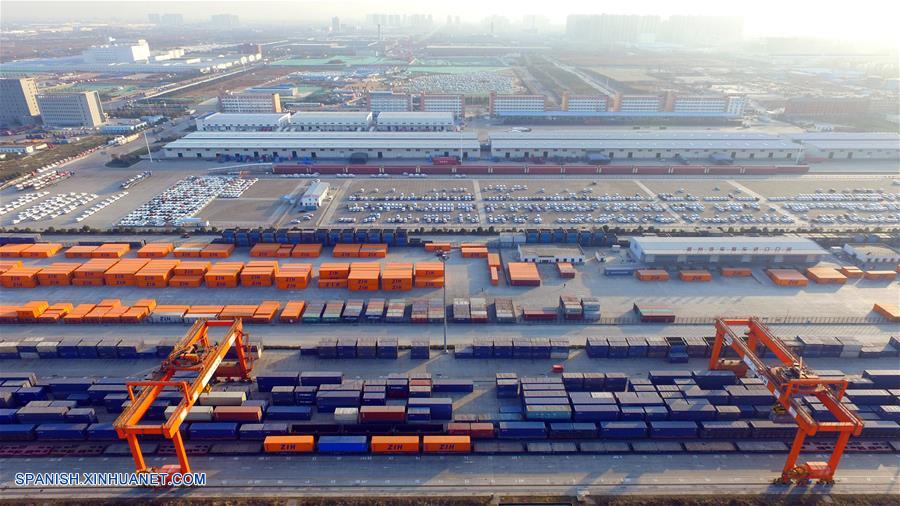 Contenedores son cargados en un tren de carga de China Railway Express, en un centro de contenedores de ferrocarril en Zhengzhou, en la capital de la provincia de Henan, en el centro de China, el 25 de diciembre de 2017. (Xinhua/Feng Dapeng)