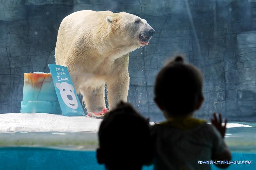 SINGAPUR, diciembre 26, 2017 (Xinhua) -- Ni?os observan al oso polar Inuka miestras se alimenta con una tarta de pescado durante su fiesta de cumplea?os, en el Zoológico de Singapur, en la ciudad de Singapur, capital de Singapur, el 26 de diciembre de 2017. El Zoológico de Singapur llevó a cabo el martes una fiesta de cumplea?os para Inuka, el primer oso polar nacido en el trópico el 26 de diciembre de 1990. (Xinhua/Then Chih Wey)