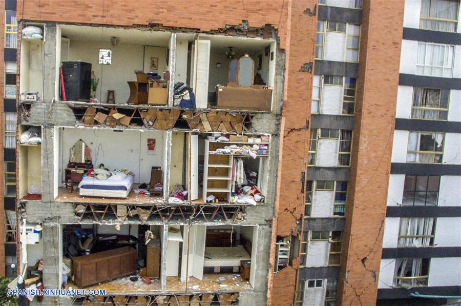 Imagen del 25 de septiembre de 2017 tomada con un dron, de los da?os en un edificio luego de un sismo, en la Ciudad de México, capital de México. El 7 y 19 de septiembre se registraron sendos terremotos en el sur y centro de México que afectaron a más de 12 millones de personas y dejaron al menos 471 muertos, casi la mitad de ellos en la capital, además de unas 180.731 viviendas con da?os en la Ciudad de México y en los estados de Chiapas, Guerrero, México, Morelos, Oaxaca, Puebla y Tlaxcala. El costo de la reconstrucción de las zonas destruidas en México por los dos devastadores terremotos de 8,2 y 7,1 grados en la escala de Richter, respectivamente, ascendería a unos 48.000 millones de pesos (unos 2.556 millones de dólares estadounidenses), según datos oficiales. (Xinhua/César Vicu?a)