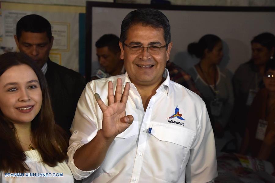Imagen del 26 de noviembre de 2017, del presidente de Honduras, Juan Orlando Hernández (d), reaccionando tras emitir su voto en la ciudad de Gracias, en el departamento de Lempira, Honduras. En 2017 tres países de América Latina y el Caribe celebraron elecciones, destacando por su importancia Chile, donde el ex presidente Sebastián Pi?era, de la centro derecha, ganó con el 54,57 por ciento de los votos al oficialista y de centro izquierda Alejandro Guillier. En Ecuador, lo que parecía una continuidad del gobierno de izquierda del presidente Rafael Correa se convirtió en la peor pesadilla. El candidato ganador de las elecciones de la segunda vuelta del 2 de abril, Lenín Moreno, emprendió una lucha anticorrupción que llegó a las más altas esferas del gobierno y mantiene en prisión al vicepresidente, Jorge Glas. En Honduras, el resultado de las elecciones del 26 de noviembre se tornó en violencia en el país centroamericano, debido al triunfo y reelección del actual mandatario, Juan Orlando Hernández, sobre el opositor Salvador Nasralla. (Xinhua/Neftali Valenzuela)