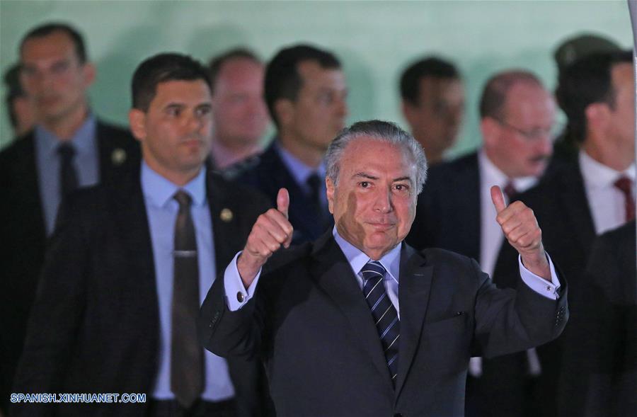 Imagen del 25 de octubre de 2017, del presidente brasile?o, Michel Temer (frente), reaccionando a su salida del Hospital Militar de Area de Brasilia, en Brasilia, Brasil. El 25 de octubre, el oficialismo alcanzó en la Cámara de Diputados los votos necesarios para evitar, por segunda vez en tres meses, que el presidente brasile?o, Michel Temer, responda a un juicio político por corrupción, como exigía la Fiscalía General. Temer, quien es el primer presidente brasile?o en pleno ejercicio de su mandato que es acusado formalmente de un delito de tipo penal y no una, sino dos veces, fue acusado por la Fiscalía General de dirigir una "organización criminal" y de obstrucción a la justicia. Una primera denuncia contra el presidente Temer por presunta corrupción pasiva fue rechazada por los diputados a inicios de agosto pasado. (Xinhua/Dida Sampaio/AGENCIA ESTADIO)