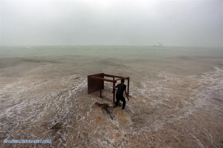 Imagen del 20 de septiembre de 2017, de un hombre recuperando un mueble de madera en la playa "El Cortesito", durante el paso del huracán María en la zona turística de Punta Cana, República Dominicana. La temporada de huracanes de 2017 en el Atlántico pasará a la historia como una de las más catastróficas y costosas de la historia en el Caribe. Harvey, Irma y María mataron a cientos de personas y destruyeron islas como Barbuda y Dominica, mientras que Puerto Rico y Cuba sufrieron gran devastación y muerte. Irma, el mayor huracán formado en el océano Atlántico con vientos que superaron los 285 kilómetros por hora, pasó por el litoral norte de Cuba de oriente a occidente, con saldo de 10 muertos y severos da?os en más de 158.000 viviendas, de ellas unas 15.000 derrumbadas, entre otras afectaciones. (Xinhua/Roberto Guzmán)