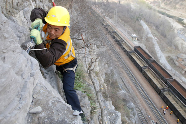 Un trabajador ferroviario sube a una monta?a para apretar las cuerdas alrededor de las rocas, de modo que no caigan hacia la ruta por donde pasa el tren. Zhengzhou, provincia de Henan. [Foto: xinhuanet]