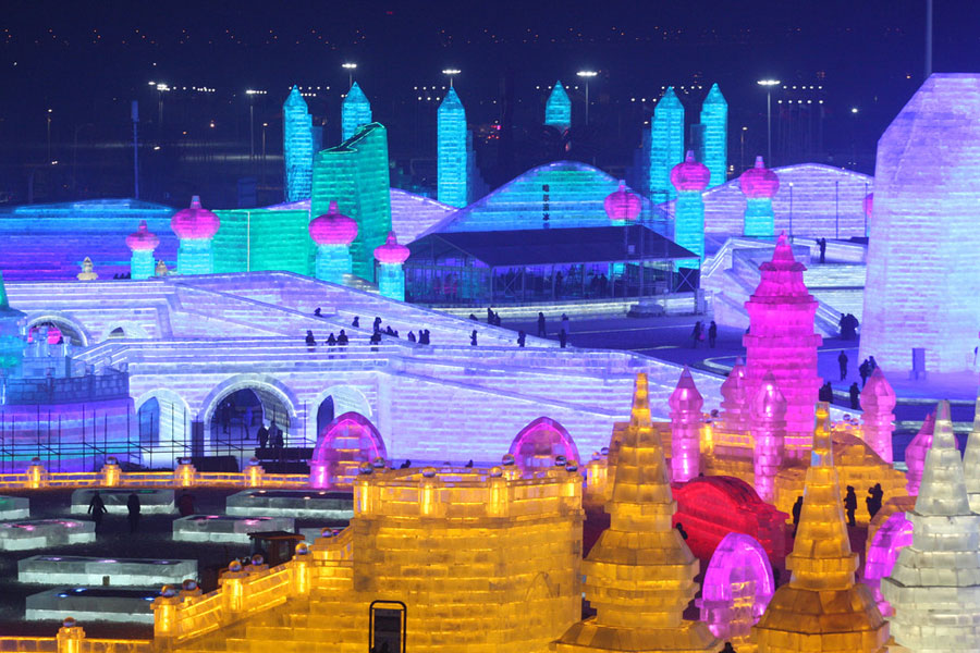 Las estructuras resplandecen bajo luces coloridas en Harbin Ice-Snow Mundo en la ciudad de Harbin, en el noreste de China, en la provincia de Heilongjiang Dec 21, 2016. [Foto/IC]