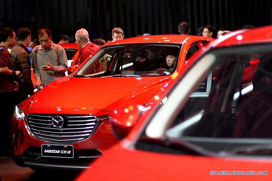 Ciudadanos observan los automóviles Mazda en la Exposición de Automóviles, en Taipei, Taiwan, en el sureste de China, el 30 de diciembre de 2017. Un total de 350 automóviles nuevos de 41 fabricantes de automóviles fueron exhibidos en la exposición que abrió el sábado. (Xinhua/Yue Yuewei)
