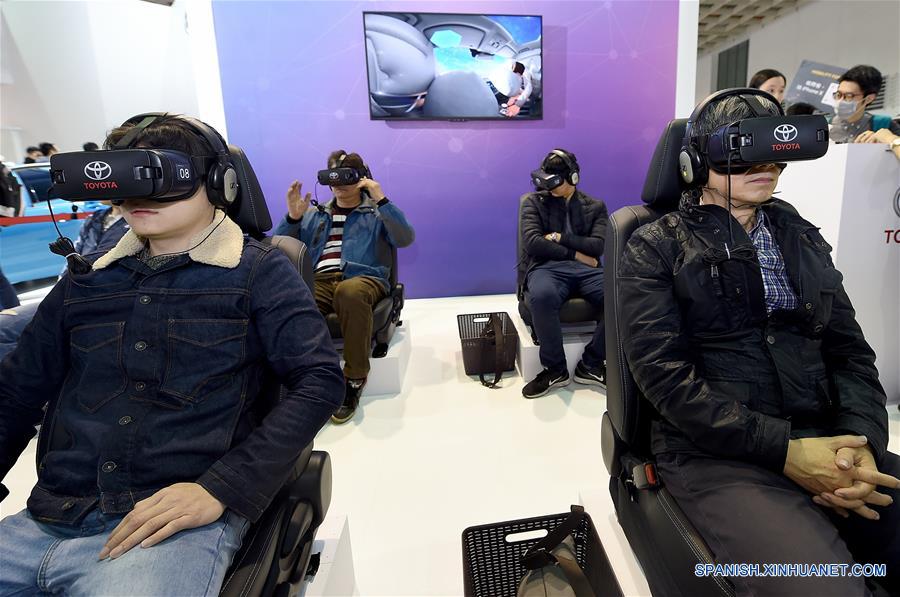 Ciudadanos que usan dispositivos de realidad virtual experimentan la conducción en la Exposición de Automóviles, en Taipei, Taiwan, en el sureste de China, el 30 de diciembre de 2017. Un total de 350 automóviles nuevos de 41 fabricantes de automóviles fueron exhibidos en la exposición que abrió el sábado. (Xinhua/Yue Yuewei)