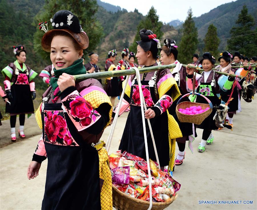 Mujeres casadas del grupo étnico Miao cargan regalos hacia las casas de sus padres, en el poblado de Wangjia, condado de Danzhai, en la provincia de Guizhou, en el suroeste de China, el 30 de diciembre de 2017. Es una tradición en el poblado local Miao que las mujeres casadas vayan hacia el hogar de sus padres con regalos festivos para dar la bienvenida al próximo A?o Nuevo. (Xinhua/Yang Wukui)