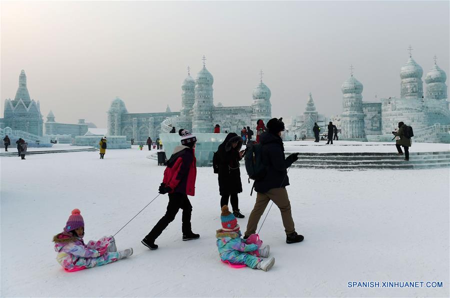 HARBIN, enero 1, 2018 (Xinhua) -- Personas visitan el Mundo de Hielo y Nieve de Harbin para celebrar el A?o Nuevo, en Harbin, capital de la provincia de Heilongjiang, en el noreste de China, el 1 de enero de 2018. (Xinhua/Wang Jianwei)