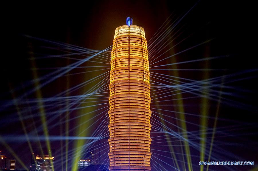 HENAN, enero 1, 2018 (Xinhua) -- Un espectáculo de luces se lleva a cabo para celebrar el A?o Nuevo, en el Nuevo Distrito de Zhengdong en Zhengzhou, capital de la provincia de Henan, en el centro de China, el 1 de enero de 2018. (Xinhua/Li An)