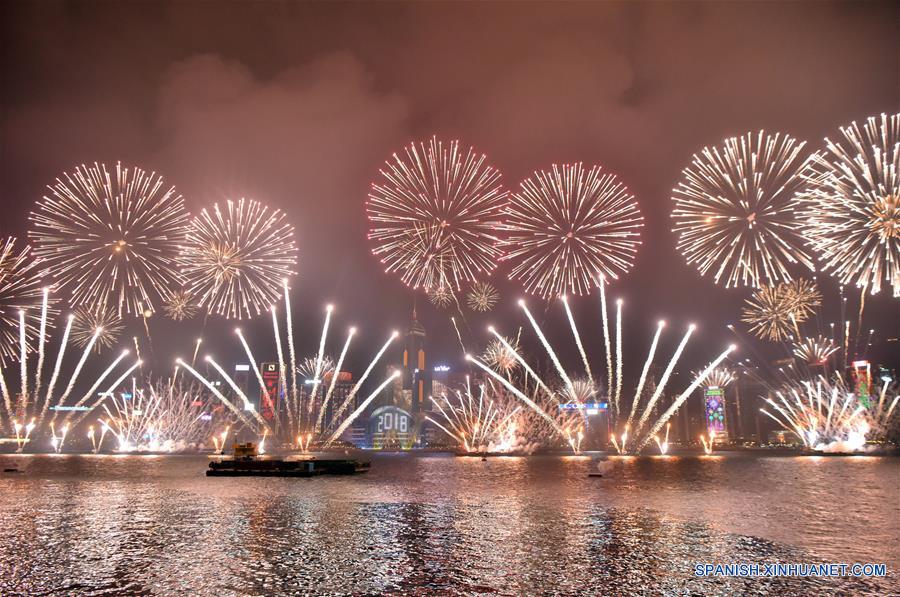 HONG KONG, enero 1, 2018 (Xinhua) -- Fuegos artificiales explotan durante la celebración del A?o Nuevo, en Hong Kong, en el sur de China, el 1 de enero de 2018. (Xinhua/Wang Xi)