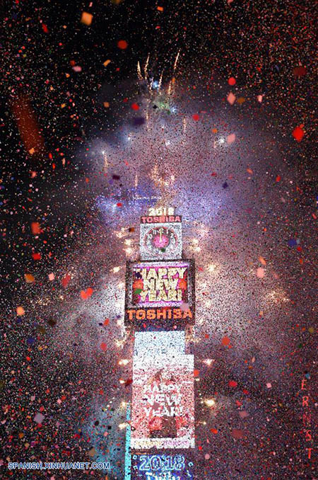 NUEVA YORK, enero 1, 2018 (Xinhua) -- Fuegos artificiales brillan durante la celebración del A?o Nuevo en Times Square, Nueva York, Estados Unidos, el 1 de enero de 2018. (Xinhua/Han Fang)