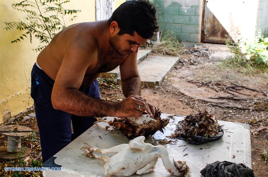 ZULIA, enero 1, 2018 (Xinhua) -- Leandro Morales, de 25 a?os y exfuncionario de la Policía Nacional de Maracaibo, participa en la preparación del tradicional primer sancocho de gallina del a?o junto con su familia, en Maracaibo, capital del estado Zulia, Venezuela, el 1 de enero de 2018. De acuerdo con información de la prensa local, el sancocho es un platillo típico de la gastronomía venezolana, que se prepara de diversas formas en las distintas regiones del país, y es una tradición consumirlo el primer día del a?o. La familia Morales lleva 5 meses en el negocio de la crianza de gallinas en el estado Zulia, mismas que utilizan para su propio consumo debido a los altos costos y la escasez de productos. (Xinhua/Andrea Romero)