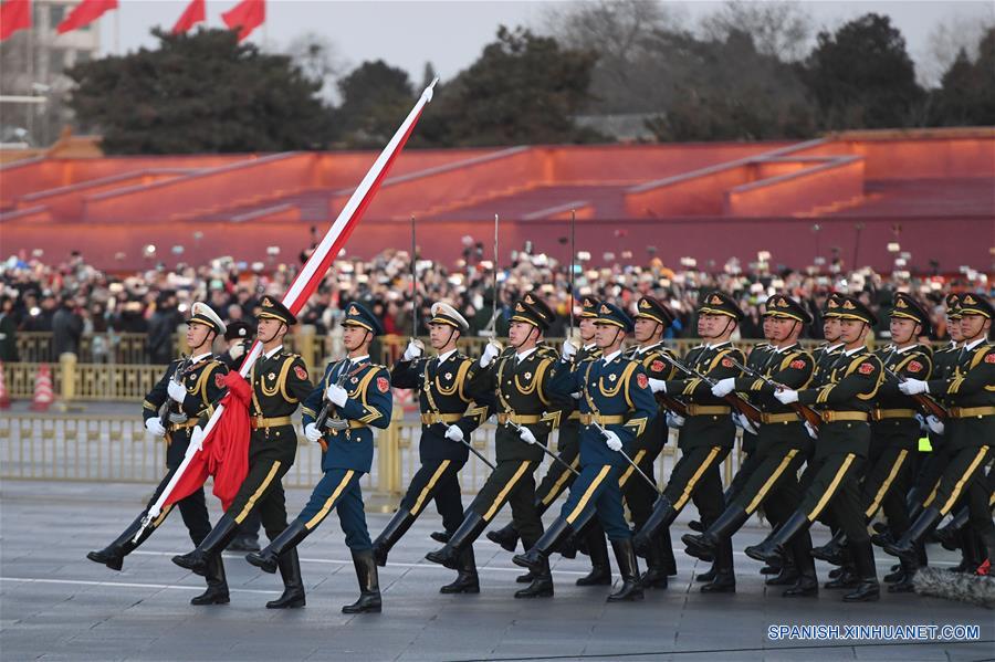 Mientras que ocho soldados en la Tribuna de Tian'anmen tocaban la corneta, otros 96 comenzaban a marchar hacia la plaza en el sur, guardando una gigante bandera roja de cinco estrellas.