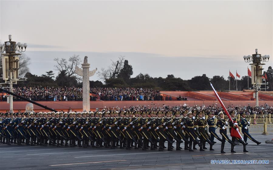 El grupo estaba encabezado por tres oficiales vestidos con uniformes militares de las fuerzas terrestre, marítima y aérea, respectivamente. Cada uno desenvainó la espada al pasar por el Puente de Aguas Doradas que enlaza la Ciudad Prohibida y la Avenida Chang'an.