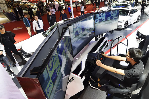 Un visitante prueba un automóvil de conducción autónoma durante una exposición en Hangzhou, capital de la provincia de Zhejiang.[Foto: Li Zhong]