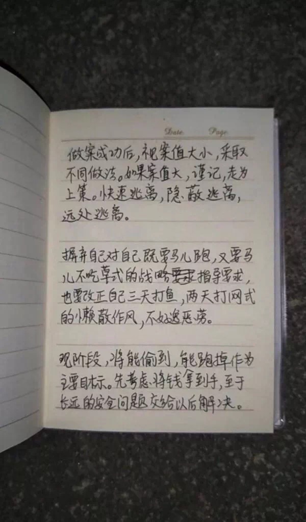 El ladrón escribe sus estrategias de robo en una libreta. [Foto proporcionada a chinadaily.com.cn]