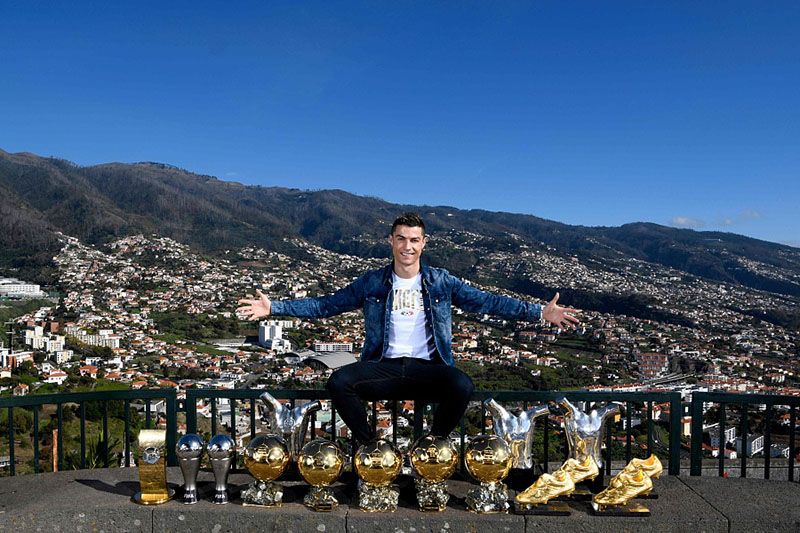 Cristiano Ronaldo posa en Madeira, su tierra natal, junto a 15 trofeos individuales ganados durante su carrera: cinco veces “Balón de Oro”; dos veces “Mejor Jugador” otorgado por la FIFA, una vez “Mejor Jugador del Mundo del A?o” otorgado por la FIFA; tres veces "Jugador del A?o" otorgado por la UEFA y cuatro premios europeos "Botín de oro", 1 de enero del 2018. [Foto: VCG]