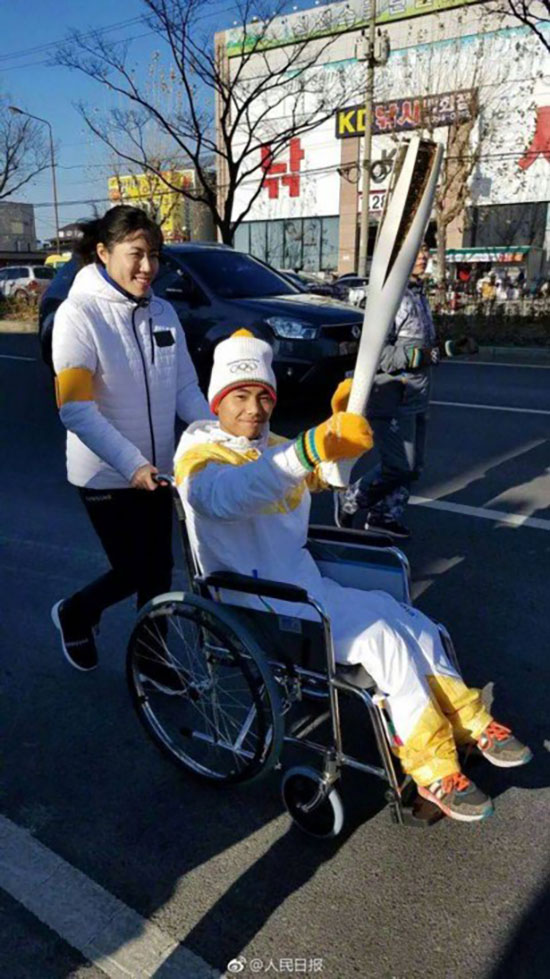 Adolescente chino discapacitado porta la antorcha de los Juegos Olímpicos de Invierno Pyeongchang 2018 |