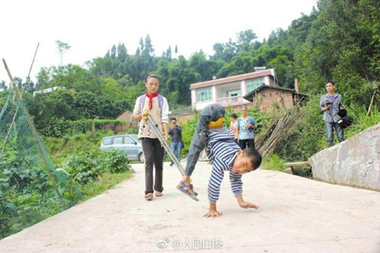 Yan, de la aldea de Jiangba en Yibin, provincia de Sichuan, quedó parcialmente inválido debido a que sufrió la polio en su ni?ez. él eligió aprender a caminar con sus manos para "correr" más rápido. Cada día,Yan demora tres horas en recorrer el trayecto entre la escuela y el hogar.