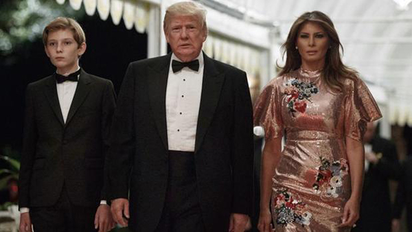 Florida,04/01/2018(El Pueblo en Línea)- El presidente Donald Trump junto con su esposa Melania Trump y su hijo Barron celebró las fiestas de fin de a?o en Mar-a-Lago, su residencia privada en Palm Beach, Florida. Para la ocasión, la primera dama Melania Trump optó por un vestido bordado del sello británico Erderm. Con este vestido de satén bordado, cuello alto y manga corta drapeada, apareció la primera dama estadounidense a la cena.