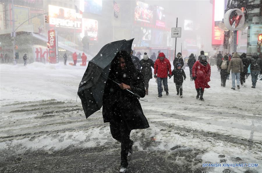 Personas caminan bajo una tormenta de nieve en New York, Estados Unidos, el 4 de enero de 2018. (Xinhua/Wang Ying)