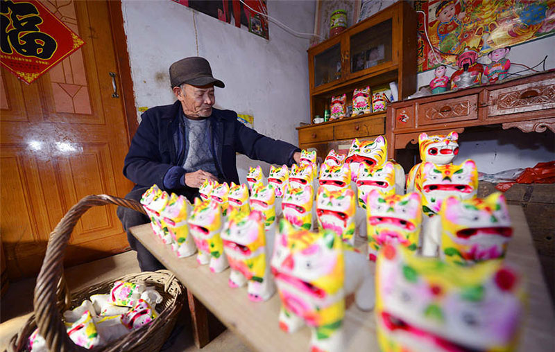 Tigres de arcilla pintada, realizados por Wei, se exhiben en su casa de Rizhao, provincia de Shandong, 3 de enero del 2018. [Foto: IC]