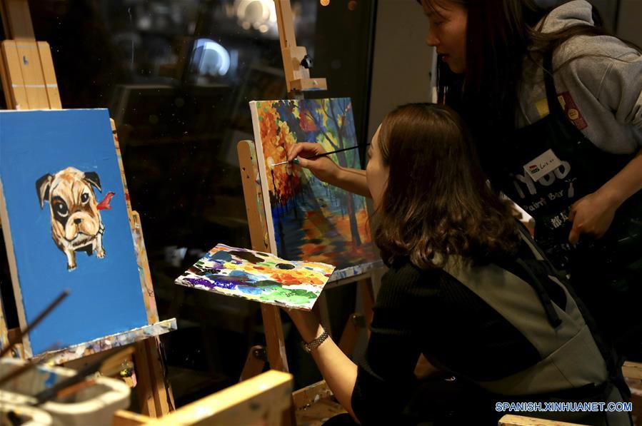 Una maestra instruye a una experimentadora en la elaboración de una pintura en un taller experiencial, en Shanghai, en el este de China, el 6 de enero de 2018. Muchos talleres experienciales recién llegaron a centros comerciales o calles del centro de Shanghai. Las personas pueden aprenden la diversión de la artesanía y la creación de arte experimentando en la pintura, el modelado de arcilla, la cocina o la elaboración de objetos de piel cosidos a mano. (Xinhua/Liu Ying)