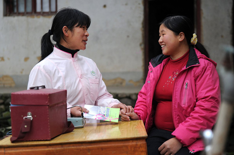 Una funcionaria de planificación familiar atiende a una mujer embarazada en Zhengang, Jiangxi. [Foto: Xinhua]