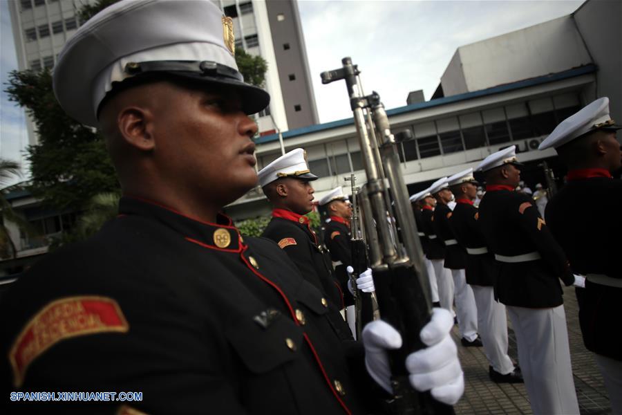 CIUDAD DE PANAMA, enero 8, 2018 (Xinhua) -- Imagen del 2 de enero de 2018, de miembros del Servicio de Protección Institucional (SPI) participando en la ceremonia de izada de banderas, durante la inauguración del nuevo período de sesiones de la Asamblea Nacional de Diputados, en la Ciudad de Panamá, capital de Panamá. El presidente de Panamá, Juan Carlos Varela, destacó el martes el establecimiento de relaciones diplomáticas con China como uno de los logros importantes de su administración en 2017. Durante la apertura del nuevo período de sesiones en la Asamblea Nacional de Diputados, Varela dijo que "2017 fue exitoso para Panamá y los paname?os", al darse en junio el establecimiento de relaciones diplomáticas con China, "uno de los acontecimientos más importantes a nivel internacional y con positivas consecuencias para nuestro país". (Xinhua/Mauricio Valenzuela)