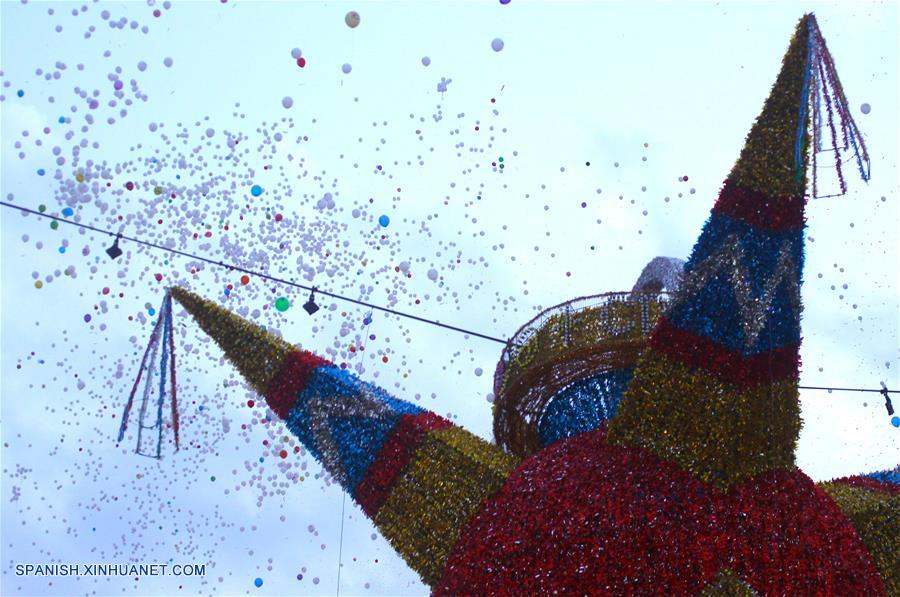 CIUDAD DE MEXICO, enero 8, 2018 (Xinhua) -- Imagen del 5 de enero de 2018, de globos con cartas para los Reyes Magos volando durante la ceremonia para partir la Mega Rosca de Reyes, en el marco de la celebración del "Día de Reyes", en el Zócalo de la Ciudad de México, capital de México. De acuerdo con información de la prensa local, el viernes se llevó a cabo la ceremonia para partir la Mega Rosca de Reyes de 440 metros de longitud, elaborada por más de dos mil panaderías y panaderos que forman parte de la Cámara de la Industria Panificadora, y que este a?o contó con una porción sin azúcar para las personas que no pueden consumirla por razones médicas. (Xinhua/Ricardo Aldayturriaga)