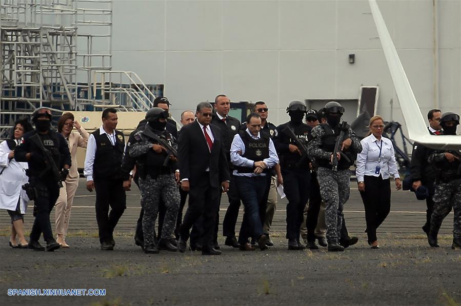 CIUDAD DE PANAMA, enero 8, 2018 (Xinhua) -- Imagen del 4 de enero de 2018, de elementos de las fuerzas de seguridad escoltando al exgobernador del estado de Quintana Roo, México, Roberto Borge (9-d), en el Aeropuerto Internacional de Tocumen para ser entregado a las autoridades mexicanas para su extradición, a 24 kilómetros de la Ciudad de Panamá, capital de Panamá. El exgobernador del estado mexicano de Quintana Roo, Roberto Borge, fue extraditado el jueves a México para que responda a las acusaciones sobre lavado de dinero y otros delitos que le imputa la fiscalía mexicana, confirmó la cancillería paname?a. (Xinhua/Mauricio Valenzuela)