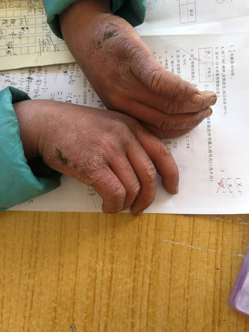 Las manos congeladas de un estudiante en la escuela primaria Zhuan Shan Bao. [Foto proporcionada a chinadaily.com.cn]