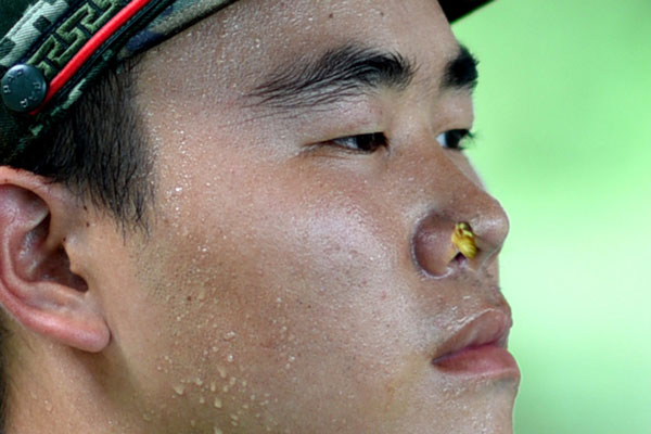 Un avispón se posa en la nariz de un recluta, pero él se mantiene erguido durante el entrenamiento en la ciudad de Shenzhen, en la provincia de Guangdong, 27 de septiembre del 2017. [Foto: IC]