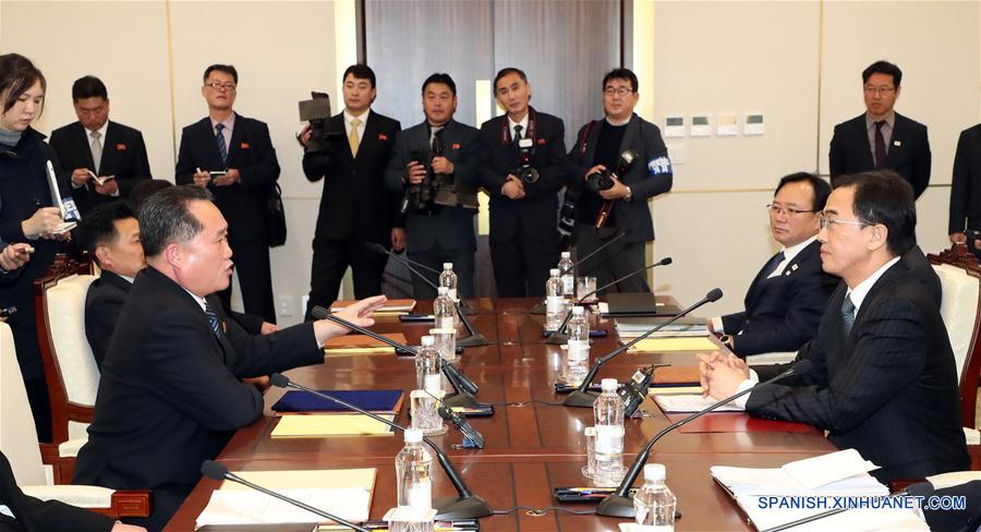 PANMUNJOM, enero 9, 2018 (Xinhua) -- El presidente del Comité para la Reunificación Pacífica de la Patria de República Popular Democrática de Corea (RPDC), Ri Son-gwon (i-frente), se reúne con el ministro de Unificación de República de Corea, Cho Myoung-gyon (d-frente), en la Casa de la Paz, un edificio sudcoreano en la aldea de tregua de Panmunjom, el 9 de enero de 2018. La República de Corea y la República Popular Democrática de Corea (RPDC) acordaron el martes sostener conversaciones militares tras el diálogo de alto nivel celebrado en el aldea de la tregua de Panmunjom, localizada en la zona desmilitarizada entre los dos países. Según un comunicado de prensa conjunto divulgado tras el diálogo de alto nivel y recogido por los medios, la RPDC acordó enviar a una delegación a los Juegos Olímpicos de Invierno 2018, que se celebrarán el mes próximo en la ciudad oriental surcoreana de PyeongChang. (Xinhua/Newsis)