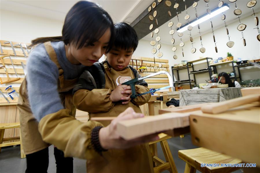 Song Lele ayuda a un ni?o a fabricar artesanías de madera en su taller, en Lanzhou, provincia de Gansu, en el noroeste de China, el 10 de enero de 2018. Song Lele, una joven de 23 a?os de edad, eligió iniciar su propio negocio en vez de hacer la educación preescolar, su especialidad de grado. "La decisión fue tomada luego de una cuidadosa consideración, que se basaba en mi afición desde la infancia", dijo Song. Después de graduarse, Song Lele viajó a varias ciudades para aprender las habilidades de la fabricación de artesanías de madera e inició su taller ya de regreso en su ciudad natal, Lanzhou. Las personas pueden fabricar artesanías de madera bajo la instrucción de Song Lele, usando las herramientas y materiales proporcionados en el taller. Las artesanías pueden ser llevadas por los clientes una vez terminadas. Con más y más personas viniendo para experimentar lo divertido de la fabricación de artesanías, Song tiene un ingreso de cerca de 10,000 yuanes (aproximadamente 1,600 dólares estadounidenses) cada mes. Song expresó su deseo al comienzo del A?o Nuevo, "Ojalá que más personas vengan a mi taller para que podamos continuar juntos esta forma de arte". (Xinhua/Fan Peikun)