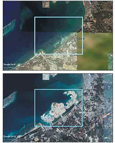Imágenes de satélite de Ocean Flower Island en 2013 (arriba) y 2017 (abajo) publicadas por la web de noticias The Paper.