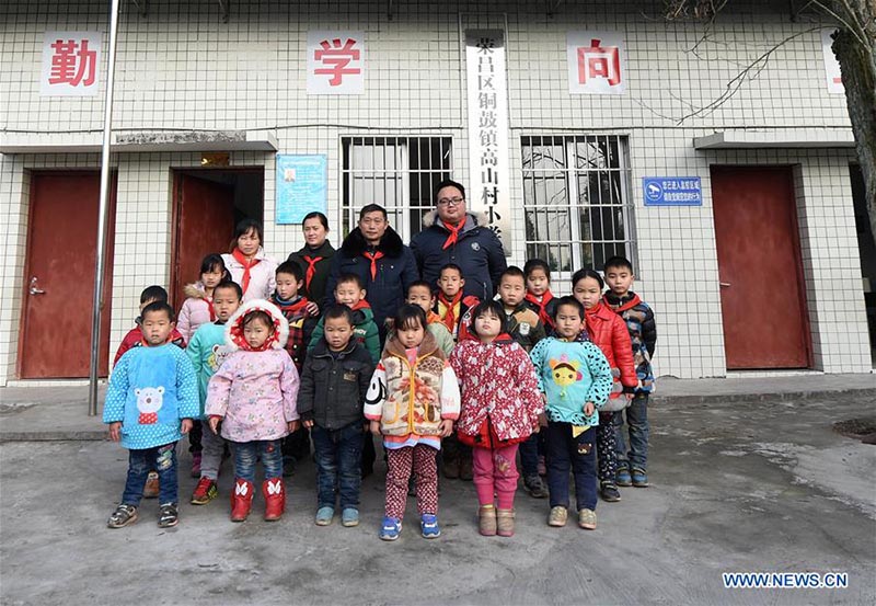 Chongqing,12/01/2018(El Pueblo en Línea)- Tan Zeguang (centro) posa con sus alumnos y compa?eros en la escuela primaria de la aldea Gaoshan de Tonggu, del municipio de Chongqing, el 8 de enero de 2018. Tan Zeguang, maestro de pueblo en la escuela primaria de la aldea Gaoshan, ha ense?ado a estudiantes en esta área remota durante 40 a?os. Tiene que encargarse tanto de las clases como de la vida cotidiana de los estudiantes cuando están en la escuela, que está a más de cinco kilómetros del pueblo más cercano. En los últimos 40 a?os, Tan ha ense?ado a más de 500 ni?os. A medida que más estudiantes eligen asistir a mejores escuelas en las ciudades, la escuela en la que Tan ense?a tiene cada vez menos estudiantes, pero Tan todavía sigue trabajando a pesar de haber alcanzado la edad de jubilación. Para su comodidad, dos jóvenes maestros han llegado a ense?ar a la escuela y continuarán su carrera docente. [Foto / Xinhua]