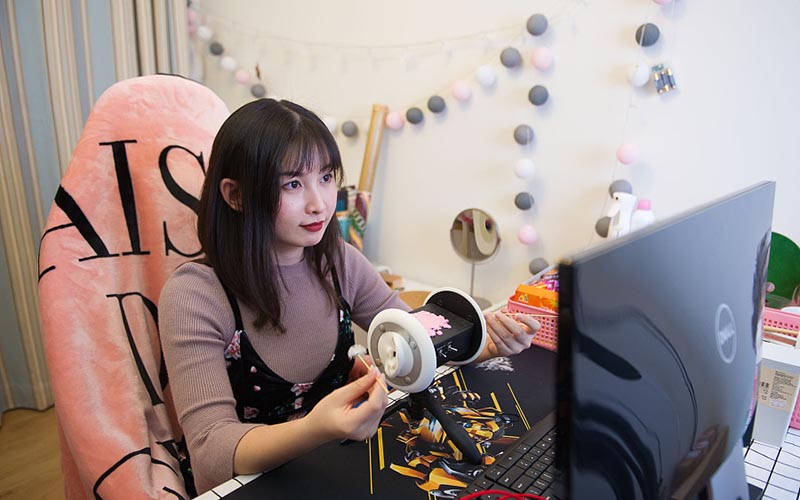 Xiu Weiya, una presentadora ??de transmisión en vivo de ASMR, produce un sonido frente al micrófono y la cámara, en Guangzhou, provincia de Guangdong, el 4 de noviembre de 2017. [Foto / VCG]