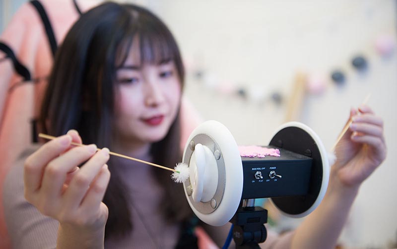 Xiu Weiya, una presentadora ??de transmisión en vivo de ASMR, pasa unas plumas de ganso por delante del micrófono, en Guangzhou, provincia de Guangdong, el 4 de noviembre de 2017. [Foto / VCG]