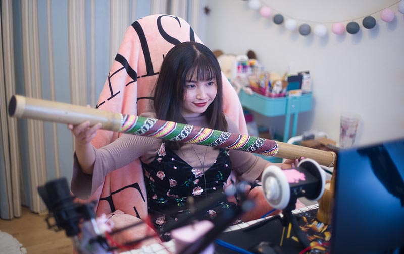 Xiu Weiya, una presentadora ??de transmisión en vivo de ASMR, utiliza el palo de lluvia para reproducir el sonido de la lluvia, en Guangzhou, provincia de Guangdong, el 4 de noviembre de 2017. [Foto / VCG]